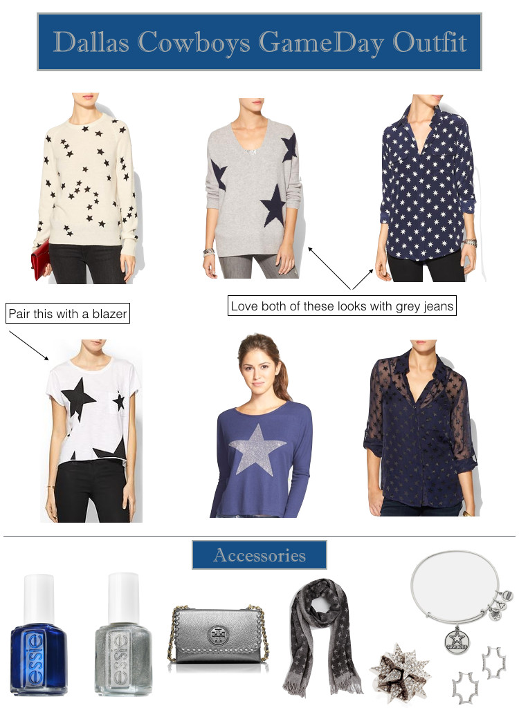 I like the idea of wearing clothes you can sport to a game, to dinner, to work and beyond. When you spend $80 on a blinged out Cowboys t-shirt, you're kind of limited. I love the plethora of tops with stars on them that are available at the moment. Pair a t-shirt top like this one with a blazer (this one is on sale!) or wear a cute sweater like this one with jeans. Add some fun silver and blue accessories (these Alex and Ani Cowboys bracelets are great gifts) and you're good to go. Even try painting your nails in Cowboys colors (this Essie silver and blue combination work).
